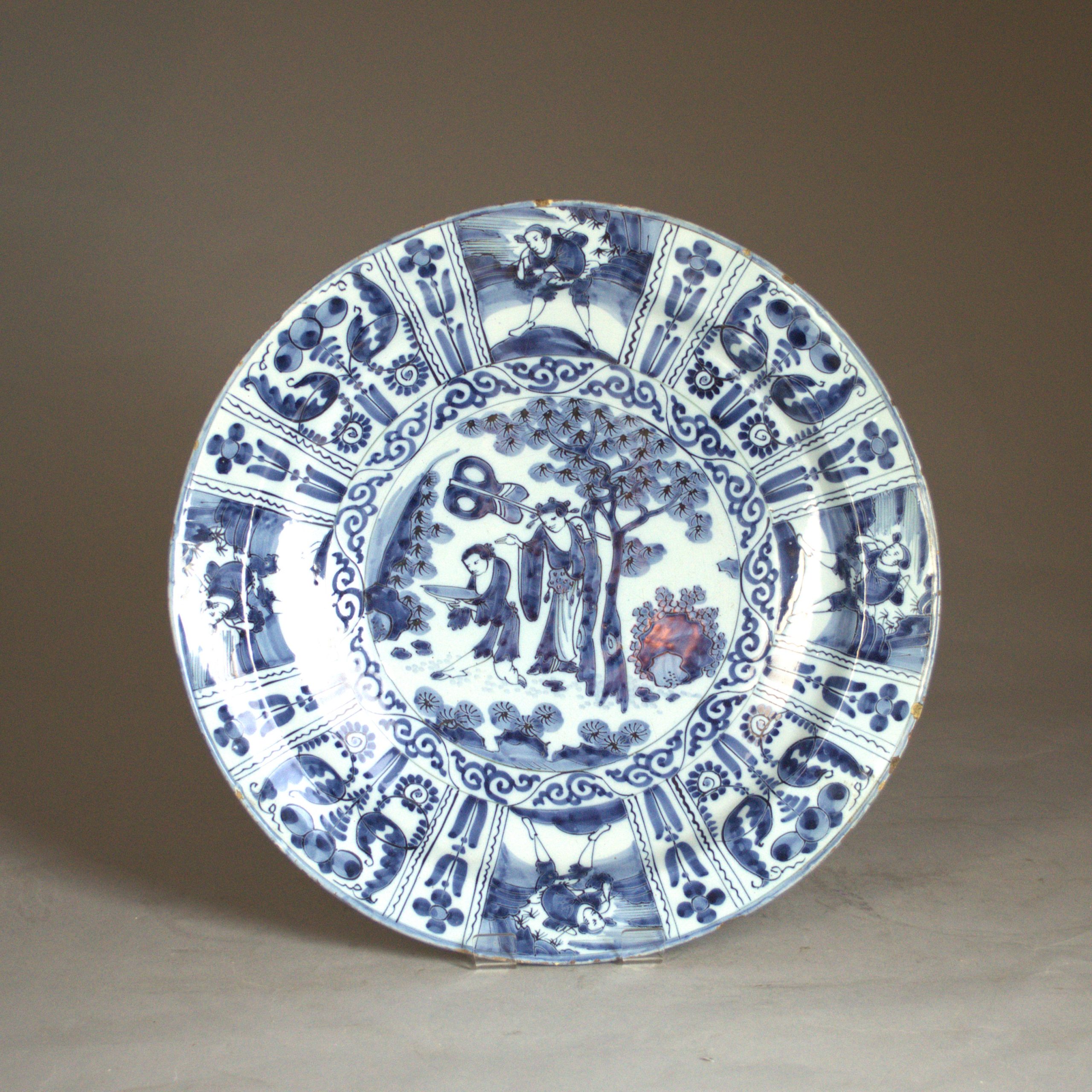 10594 A large Dutch Delft Kraak charger, the central panel decorated with a lady and her servant, within an eight panel border with alternating flower scrolls and serving figures, the reverse with circle decoration, on a raised foot rim pierced for suspension. Small glaze chips to the rim.