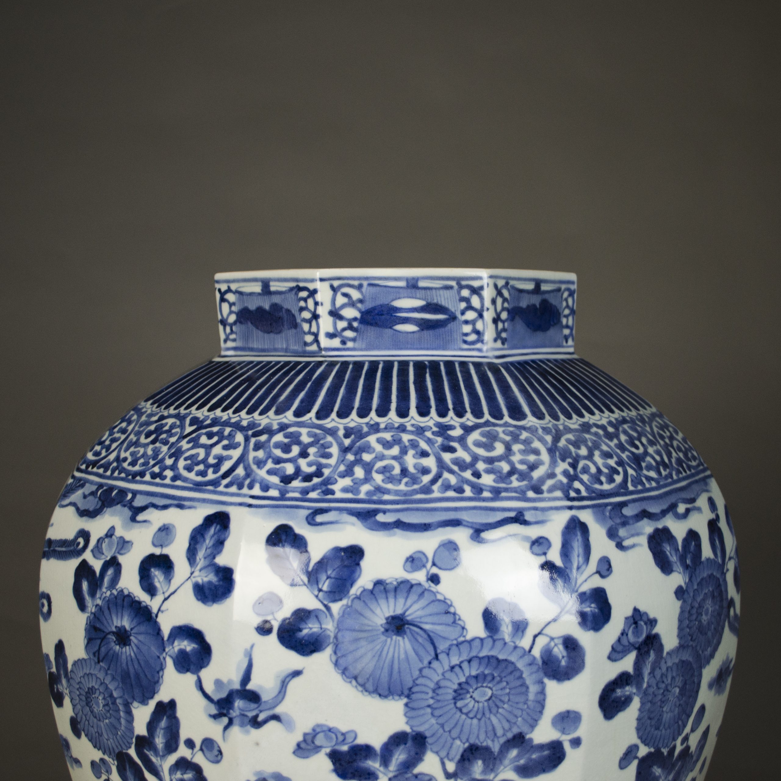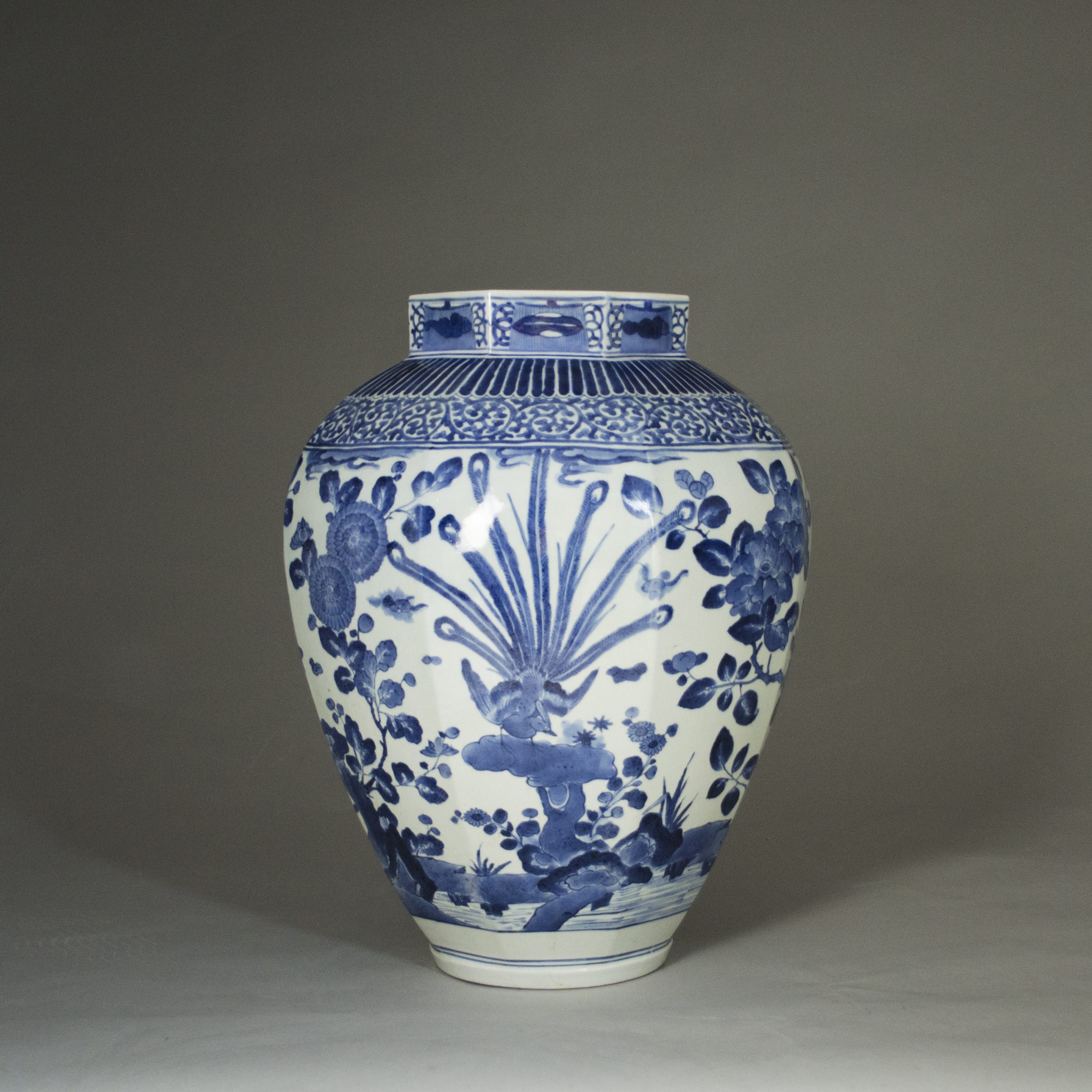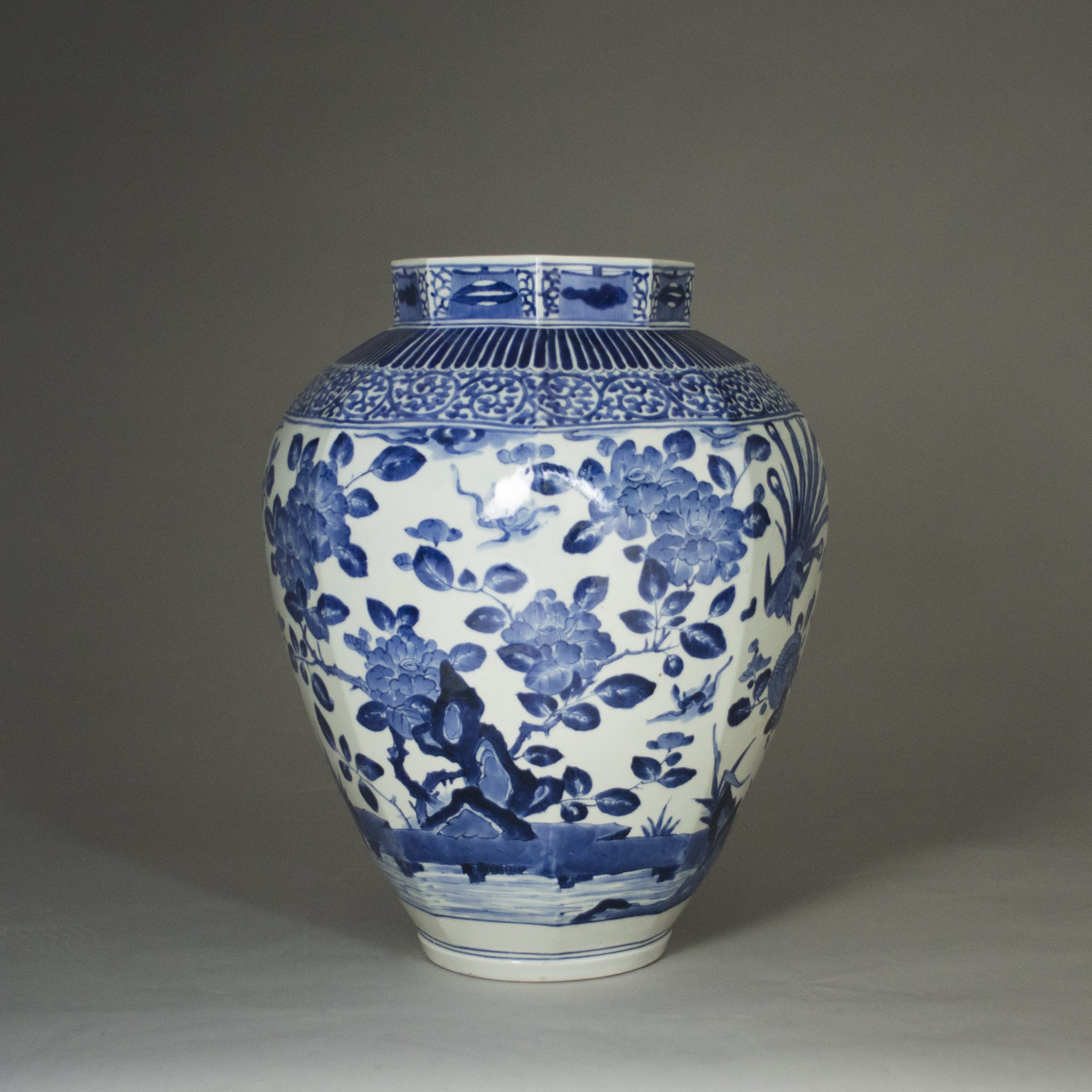 10183 A large Japanese Arita porcelain blue and white octagonal vase, the neck decorated with a border of lappets with flower scrolls, the body with a phoenix among peony and chrysanthemum bushes. Re-stuck piece to the rim, restored body crack. Japanese 1680 Height: 51 ins (20 cms) Sold Categories: Ceramics, Vases, Works of Art Related products French Louis XVI Style Gilt Bronze Mounted Qianlong Vase Read more A French Wax Cast of L’Ecorche After the 1766 Model by J.A Houdon Read more A Pair of Japanese Patinated and Gilded Bronze Vases Read more Louis XIV Olivewood and Brass Mounted Coffer Read more