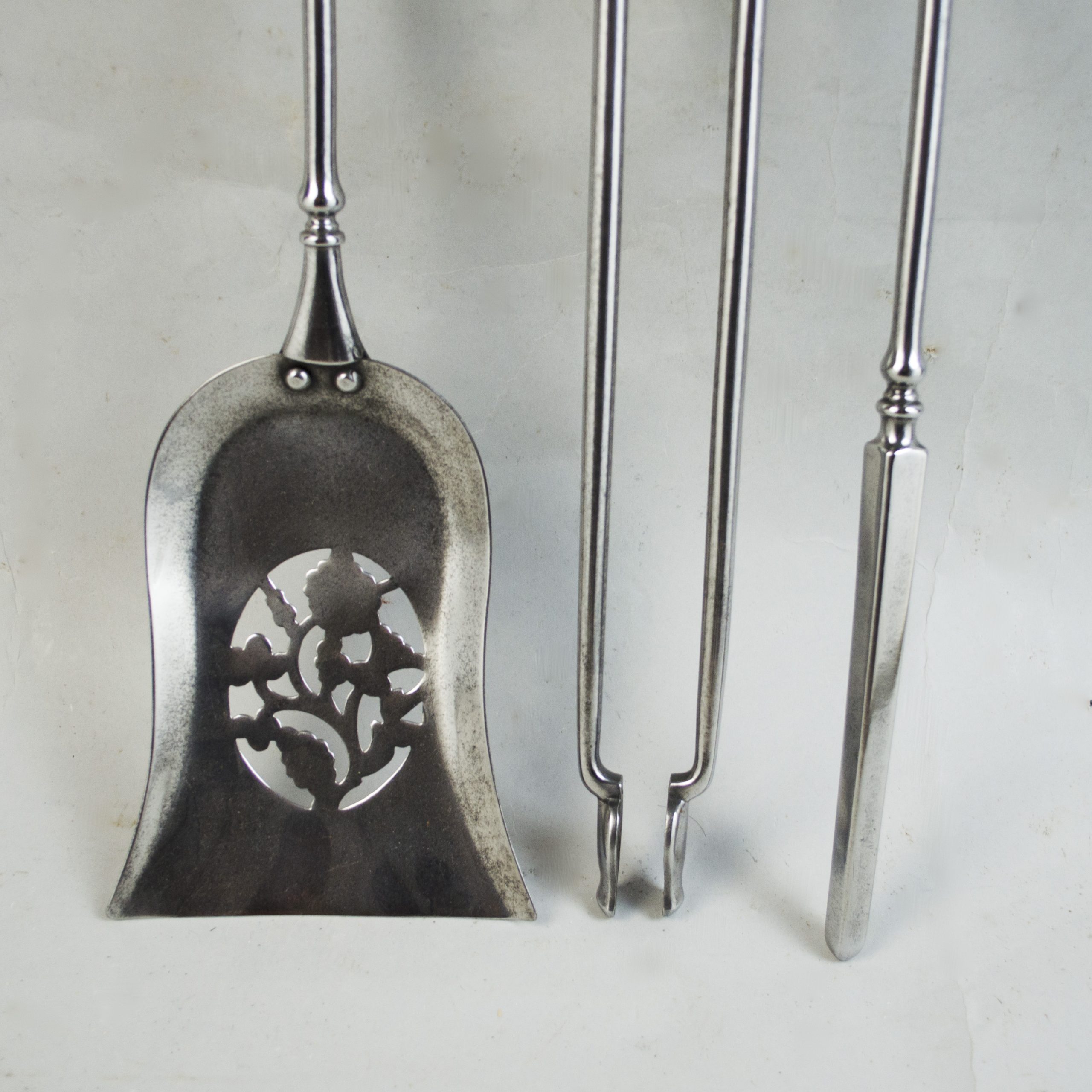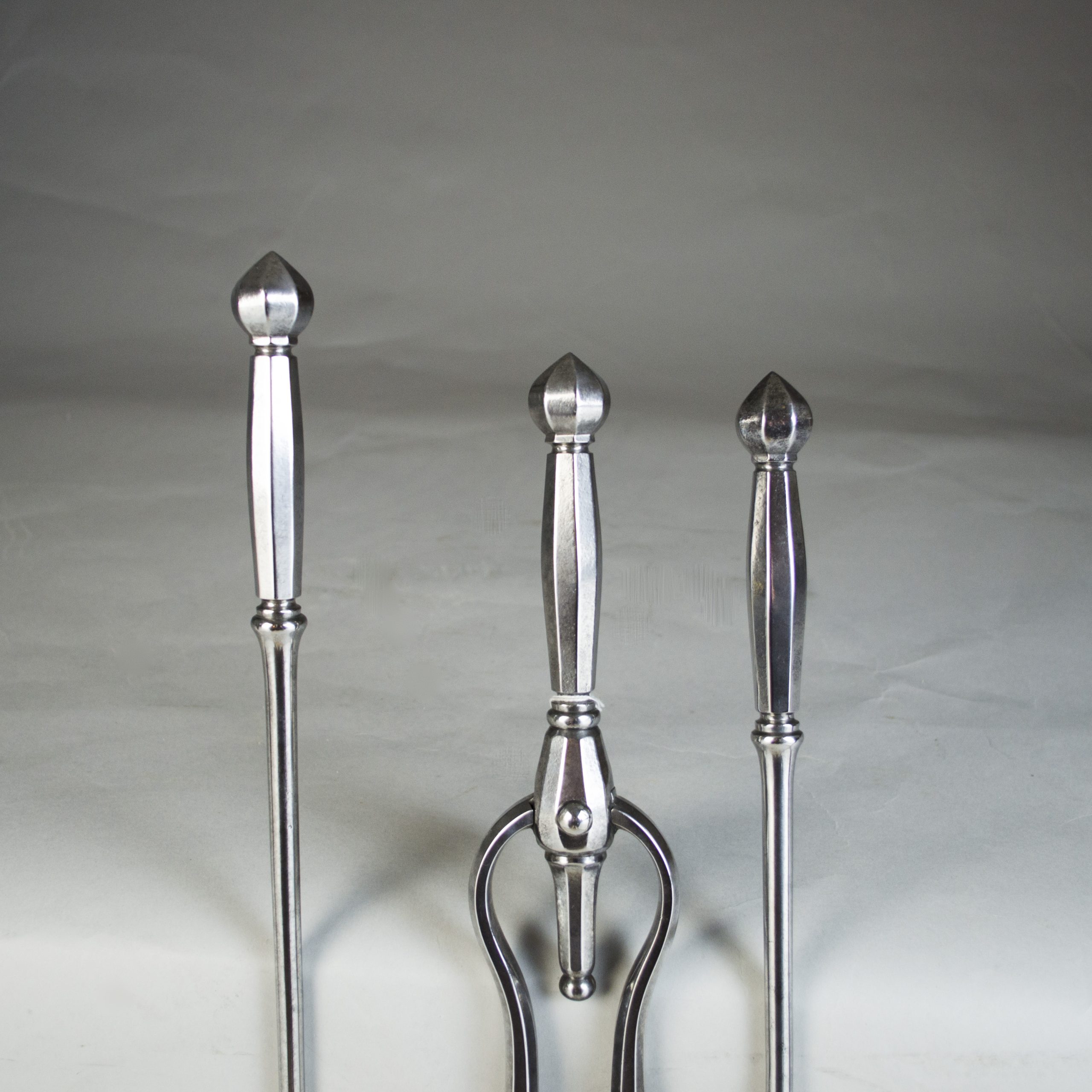 10252 A set of Victorian steel fire tools, with octagonal faceted handles and finials, plain stems and pierced shovel. English 1850 Height: 31.5 ins (80 cms) £1,250 Categories: Fire, Furniture Related products Louis XIV Olivewood and Brass Mounted Coffer Read more A Pair of Early Victorian Painted and Gilded Needlework Stools Read more Pair of Italian Iron and Bronze Fire Dogs Read more Bernard Molitor Mahogany Commode Read more